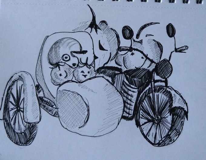 @inktober #inktober2021 #Inktober #inktober2021day15 #ArtistOnTwitter #illustrations "The #NaughtyPumpkins have acquired a get away vehicle. Don't forget your #Helmet " 🧡🎃🧡🎃