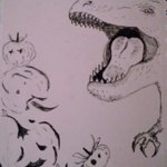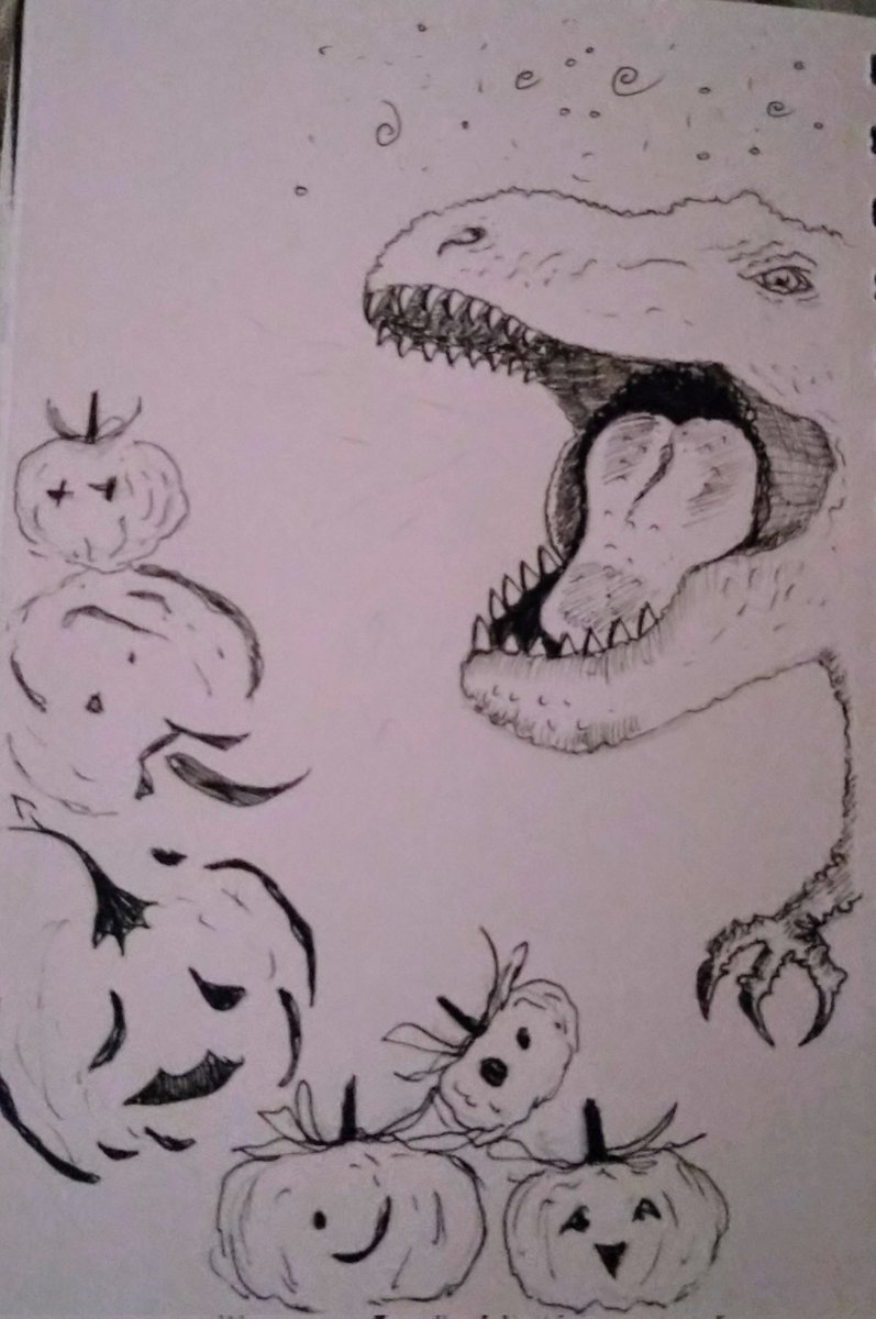 #inktober2021 #Inktober @inktober #inktober2021day25 #Splat "The #NaughtyPumpkins have knocked out the T Rex, with a handy anvil" 🎃🦖🎃 #ArtistOnTwitter #illustration