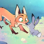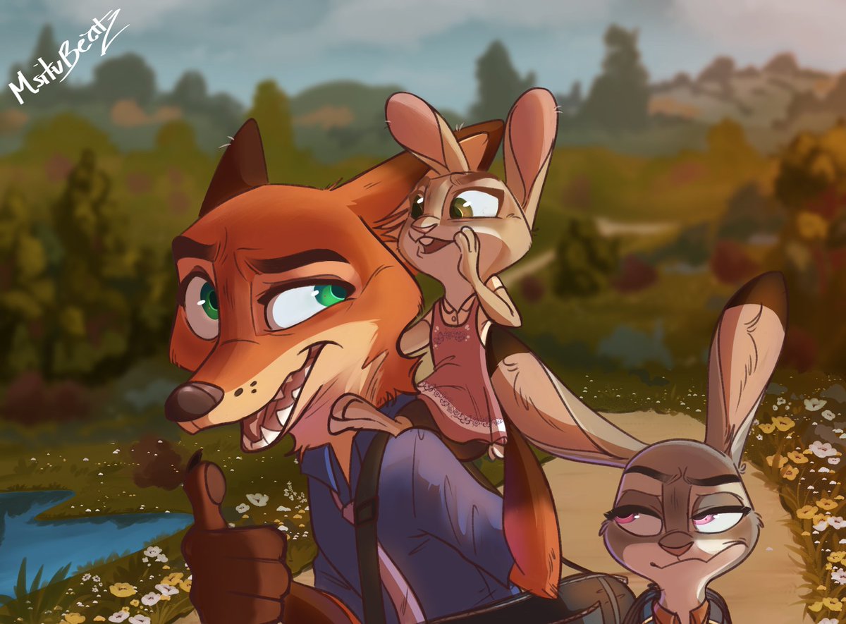 Nick and Judy visiting BunnyBurrow, heading to the Hopps home with Cotton Got inspired to draw a scene from the origin story I'm working on for my ocs. #Zootopia #NickWilde