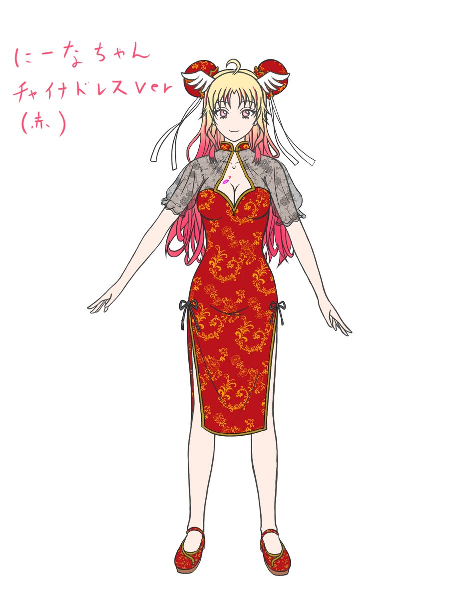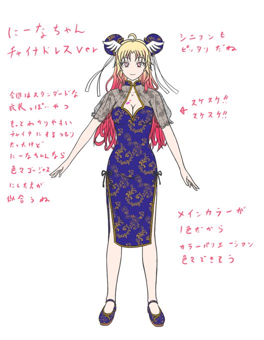 第二弾作成しました~ にーなちゃんのチャイナドレス衣装!! 自分の趣味盛りまくったから、 描くのめっちゃ楽しかった~ カラバリも作ったからどっちが好きか意見ください~ #月城にーな新衣装予想FA #Nina_chan_art
