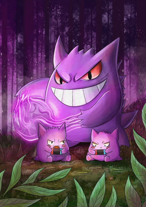 Hace un mes intentaba pintar fondos y me daba hasta dolor de cabeza, poquito a poquito ya me van saliendo mucho mejor. Gengar y sus mini gengars. 💜 3h y 12m. #gengar #gengarpokemon #Pokemon #pokemonfanart #pokemonart #NintendoSwitch #NintendoSwitchOnline