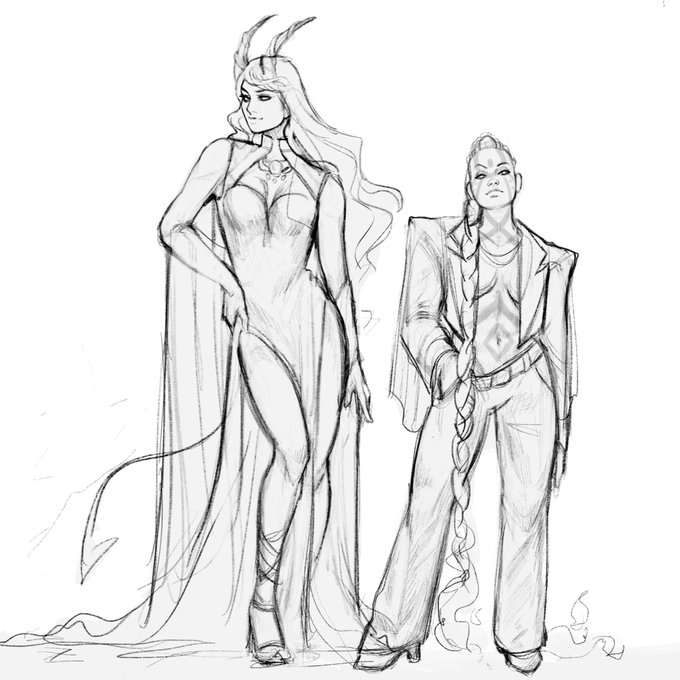 Sketch for #OCGala2022 that I ran out of steam on 😩 tol tief goddess is Descant💎 and belongs to @DianaSousaArt and smol fire genasi barb is my girl Epa🔥