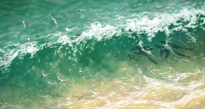 "waveriders" pod of plesiosaurus investigating the coastline you can watch the timelapse for this painting on my youtube: youtube.com/watch?v=Vosqny… #paleo #paleoart #plesiosaurus #pterosaur #ocean #beach #slay