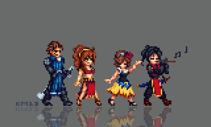 Olberic and Primrose accompanying a dancing Agnea and Hikari hitting the notes #pixelart #OctopathTraveler #Octopath5thAnniversary #オクトラ5周年