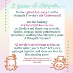 july 13th will be #OctopathTraveler’s 5th anniversary! share your love for the games on the date using the tag #Octopath5thAnniversary! 🐙 OT, OT2, COTC…all travelers are welcome to join!! let’s celebrate 5 years of the OT series together 🎉 #オクトパストラベラー