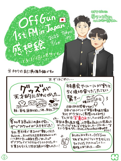 #OffGun1stFMinJP の感想絵✍️💚🤍 書きたいことが多すぎてだいぶ時間が経ってしまったし、文字量がすごいことになった😂 タイ沼に来て初めて推しに会うイベントとして最高なイベントでした🙏 OffGun、Babii👶🏻、関係者の方々本当にありがとうございましたー✨ #ออฟกัน #OffGun ##OffGunfanart