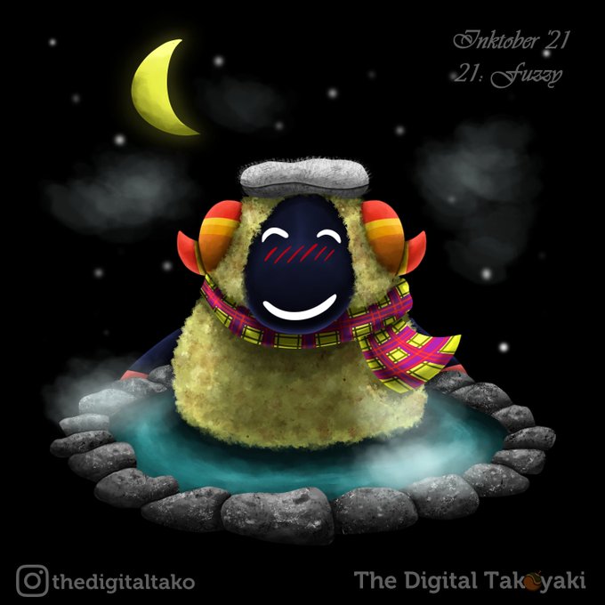Inktober 21: Fuzzy A relaxing night 安心な夜 #Inktober #inktober2021 #illustration #digitalart #イラスト #アート #Ilustración #artedigital #イラスト好きな人と繋がりたい #animalcrossing #acnh #vesta #onsen #fluffy #japaneseculture #kawaii #どうぶつの森 #あつ森 #メリヤス #フワフワ