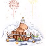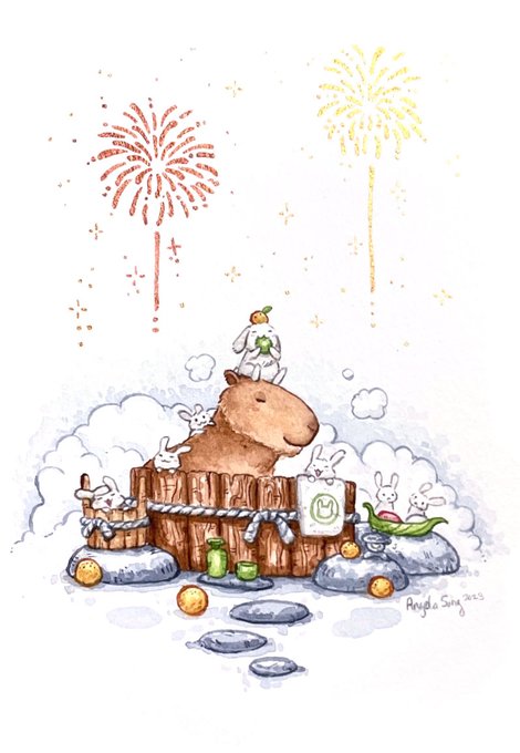 My piece “Onsen Party” for the @giant_robot Year of the Rabbit art show, opening this Saturday Jan 14 🤗 #gryearoftherabbit #lunarnewyear #yearoftherabbit #capybara #rabbit #onsen #watercolor #illustration
