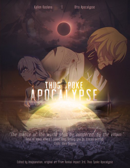 Thus Spoke Apocalypse poster. "The malice of the world shall be sundered by the villain." - Otto Apocalypse #Fanart #HonkaiImpact3rd #ottoapocalypse #kallenkaslana