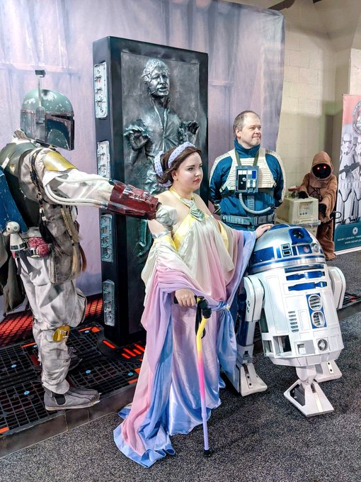 I got to have my Selma Blair red carpet moment at @GameOnCleveland ! So many photos! My matching lake dress Padme cane was made by my love @TazunayHitori . 💛🌸💜 #StarWars #PadmeAmidala #disabilityinclusion