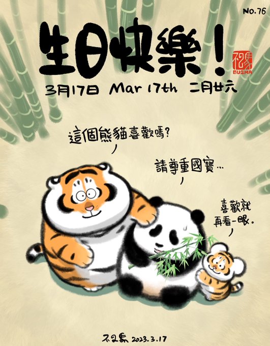 3/17 Happy birthday to you! 🎂🐯🎁 Alexander: Do you like this panda? Panda: Please respect the national treasure... Tiger cub: If you like it, take another look. #happybirthday #birthdaygreeting #bu2ma #artist #tiger #fattiger #greetingcard #project #panda