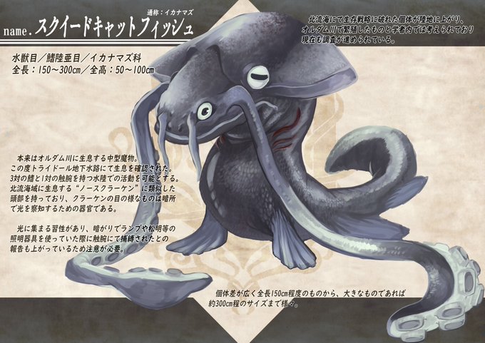 【PFSOZ】オルダム川からの来訪者【魔物発見報告書】 | 獣ノ屋 #pixiv #PFSOZモンスター #新都市トライドール pixiv.net/artworks/10258… 新都市の地下水路にナマズもどきを解き放ちました!
