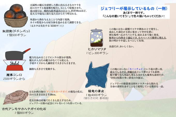 【PFSOZ】ふれあいアウトドア展示物(一例)【豊穣の祭典】 #pixivファンタジアSOZ #PFSOZ #アラディア院 #【アラディア院】野外実習 #豊穣の祭典 #【ふれあいアウトドア】 #PFSOZ植物 #PFSOZ道具素材 pixiv.net/artworks/10327…
