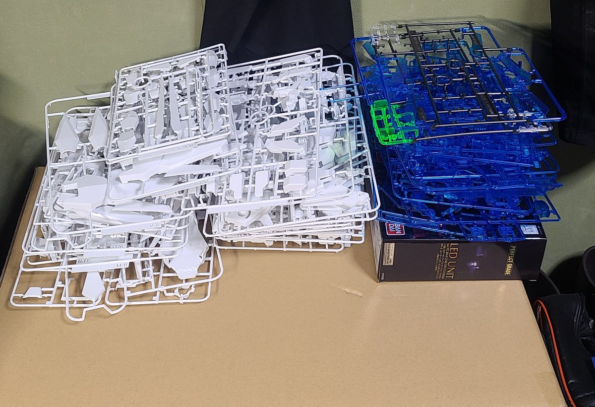 ひとまずフレームの切り出し終了(´・ω・`)これから2度切りして面処理、ヒケ、パーティングライン消し、ダボカットetc... その前に塗装用のクリップとパーツケース買い足さないと💦 #PGペルフェクティビリティ #ガンプラ好きと繋がりたい #ガンプラの画像貼るとRTされると聞いて #ガンプラ
