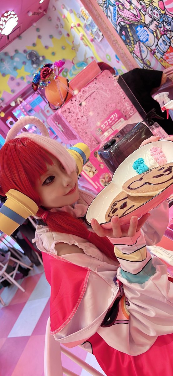 ウタの好きなものである、かわいくてホイップましましのパンケーキ食べてる🥞 めちゃくちゃかわいいクマを書いてもらった🖌 このクマは.........🧸 #アコスタ道頓堀 #道頓堀コスプレ祭 #pinkkawaii