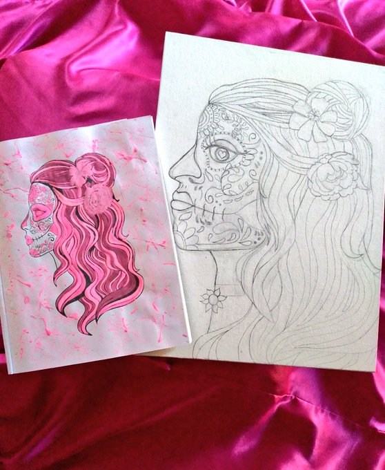Ready to paint! 🌸💀#artwork Inspired by the Tattoo Coloring Book for Adults by @lory_dobrin Remember when I did a live art cosplay to look just like the illustration I was #painting?👇 #Girls #Artist #artistontwittter #PINKTOBER #inktober2022 #InkDrawing #October #selfies