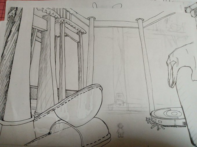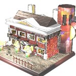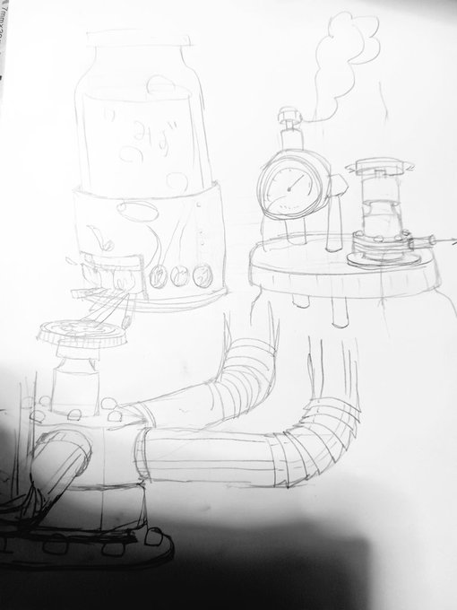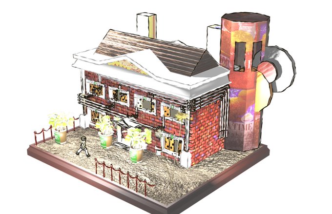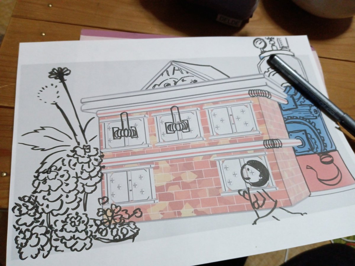 古い住宅街。 大きな蒸気塔からの蒸気が窓の開け閉めや暖房など様々な動力源に利用しているため、壁一面にストローでできた配管がある。また当時は大型作業機械が無かったため、お菓子の箱を小さなレンガとして使っている。 という設定。 #PORDO #オリジナルイラスト