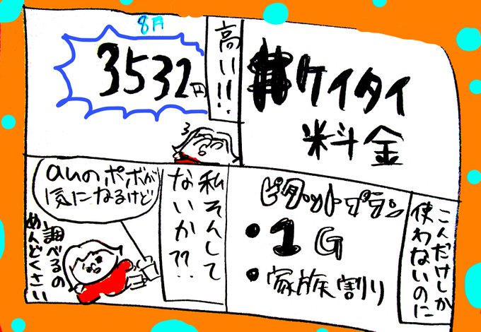 【#au:ケイタイ料金】 『ピタットプラン』 8月・・・3532円(高い) こんだけしか使えないのに・・・ 1G超えると+1000円(4500円) 「私スマホプラン損してない?」 auのパボが気になる。でもメリット・デメリット。使い方調べるのめんどくさい #povo #漫画が読めるハッシュタグ #コミックエッセイ