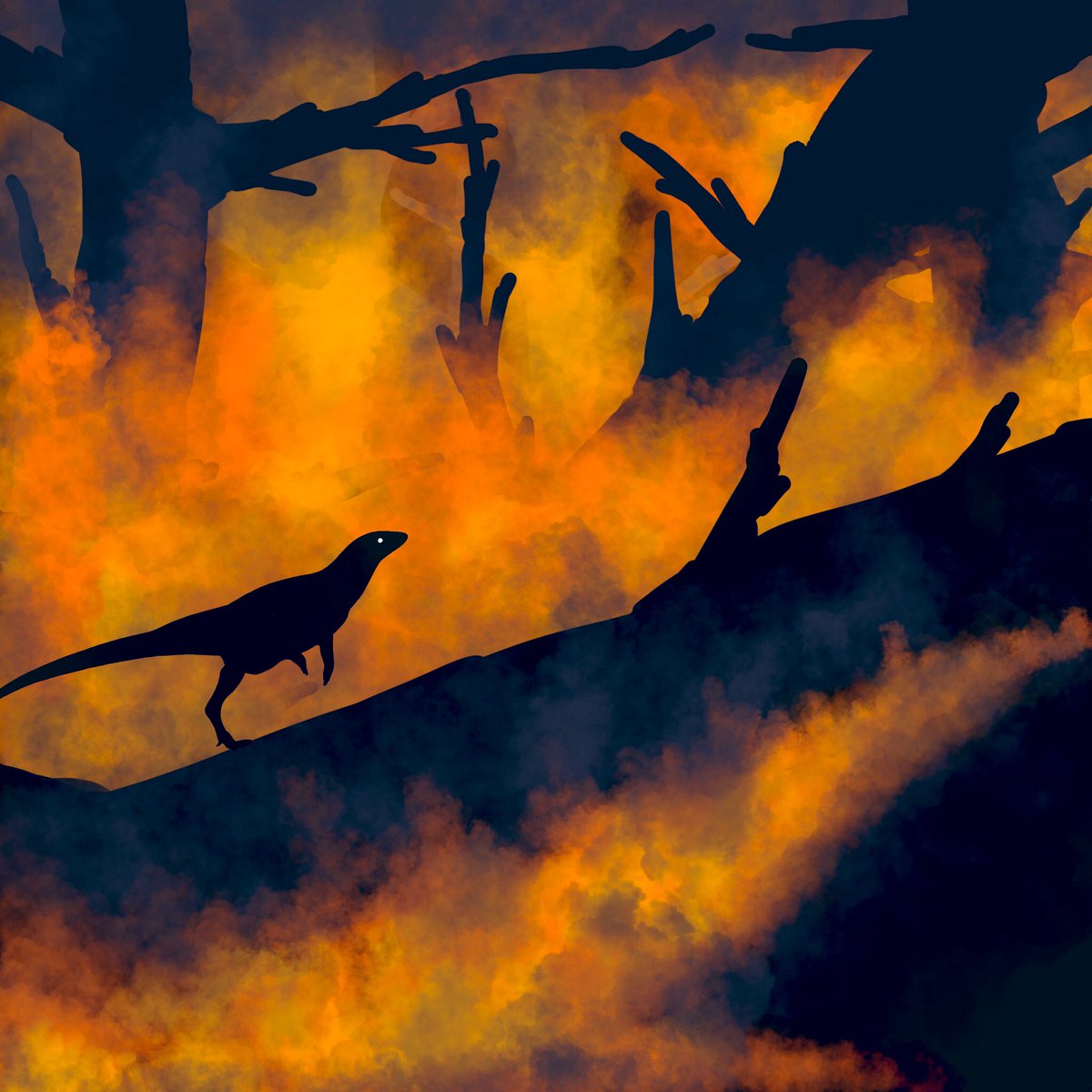 Day 4 of #PRDinovember2021. What was once the verdant territory of a male Changmiania liaoningensis is reduced to smoldering ash and cinders as a fire sweeps through the undergrowth. #Dinovember #sciart #paleoart #paleontology #DigitalArtist