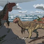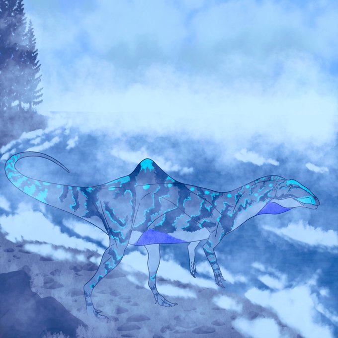 Day 22 of #PRDinovember2021. Concavenator corcovatus traverses the shoreline on a misty morning. #paleoart #paleontology #sciart #Dinovember #ArtistOnTwitter