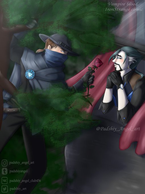 Ah, first love, sometimes it's unpredictable. And to surprise your chosen one, you're even willing to climb a tree, aren't you, Tony? Well, a kiss with the vampire you love is worth climbing a tree for. Just don't fall, Tony. #Padshiy_Angel_art #ironstrange #strangeiron