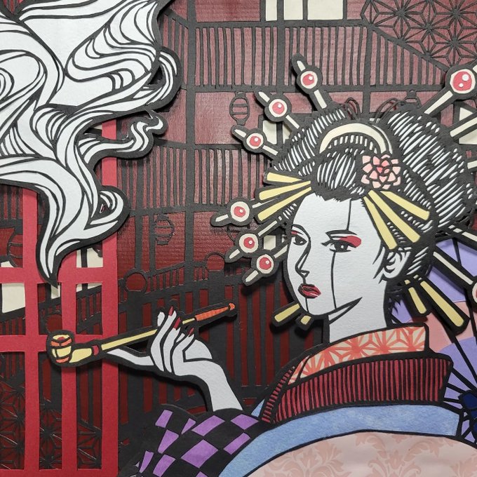 切り絵掛軸『間(あわい) 』は4/9までの展示です。 琳派によって多く制作された「描き表装」にならい、掛軸全体を切り絵で表現。国宝修理を手がける岡墨光堂による透ける表装にもご注目ください。 間 In Between 2019 土佐和紙 #望月めぐみ切り絵展 #富士川切り絵の森美術館 #切り絵 #papercut