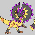 Shocking Spit Electric/Poison ancient paradox HELIOLISK, based on the Dilophosaurus from Jurassic Park. Their sticky saliva can retain electricity and will shock its prey when hit with. #PokemonScarlet #PokemonViolet #paradoxpokemon #PokemonScarletViolet