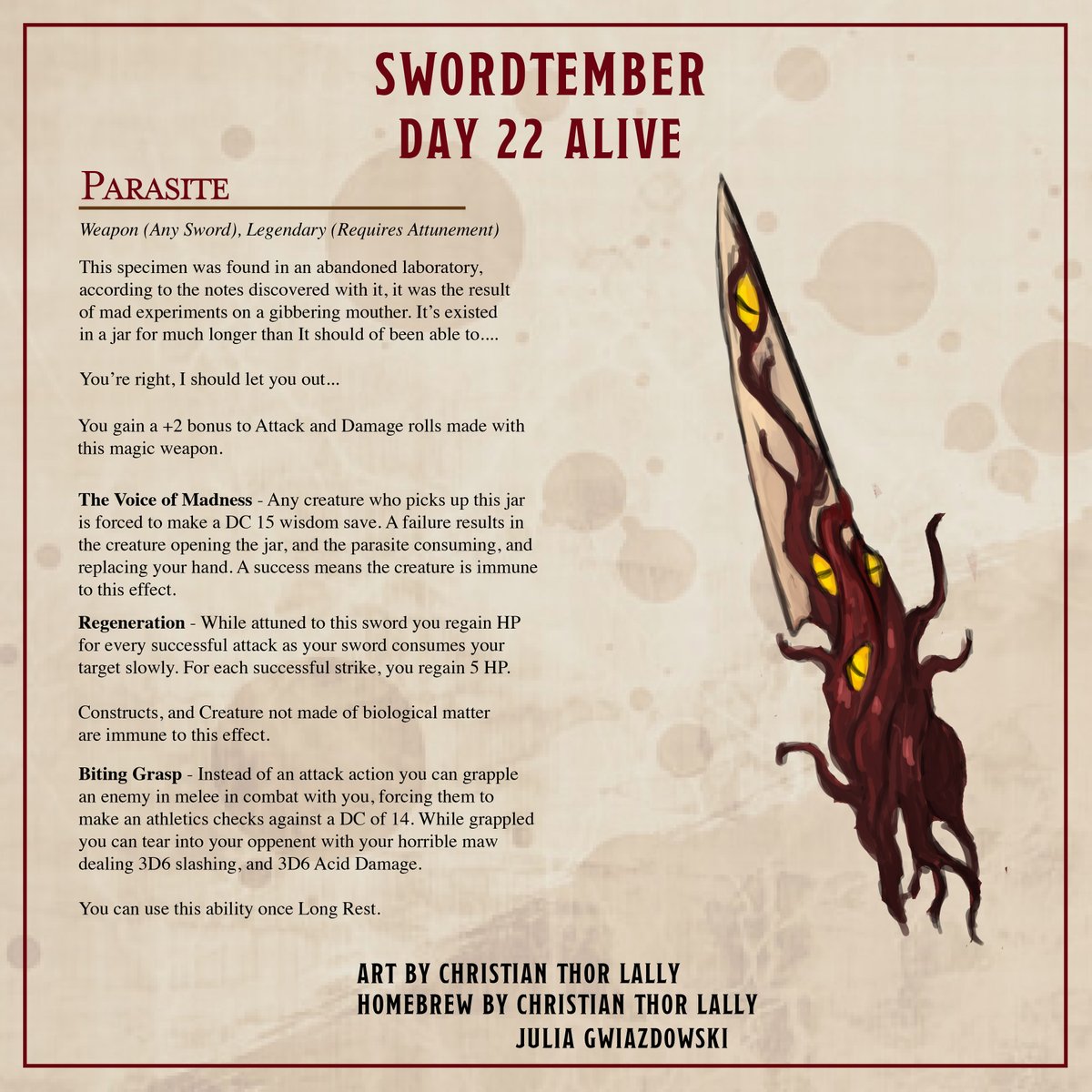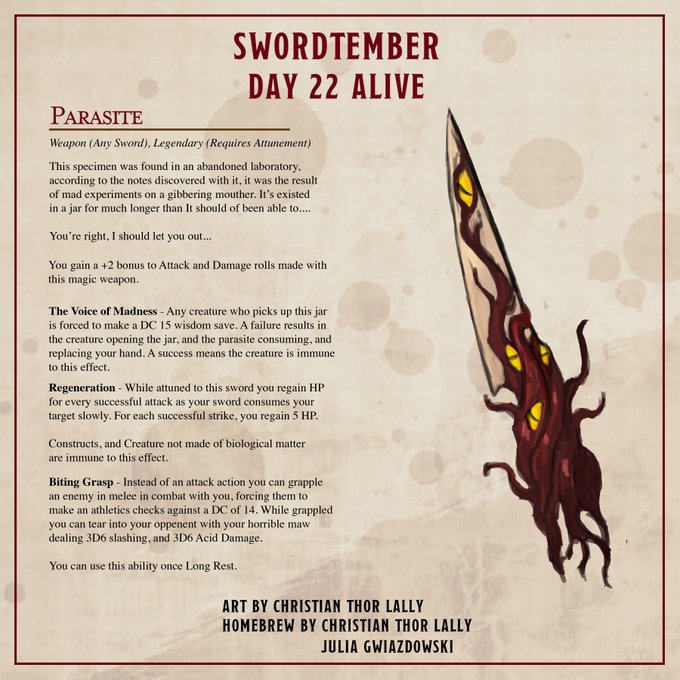 Swordtember Day 22 Alive Wearing my anime loving pride on my sleeve again with another creepy flesh sword. Heavily inspired by Parasyte, and The Laughing Hand. #swordtember #Swordtember2021 #DnD #dungeonsanddragons #Parasyte #thelaughinghand