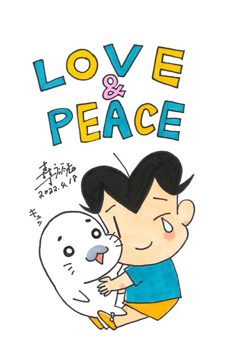 ゴマちゃんとアシベがウクライナで大変な状況の人々にハートを送ります。 (LOVE&PEACEイラストはだがしやゴマちゃんで展示販売予定。収益は全てウクライナに寄付します。) #PeaceForUkraine