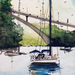 New painting. #Boats and the connected #bridge. #watercolorpainting #penandink #handmade #watercolor #illustration #draw #blue #art #trees #watercoloring