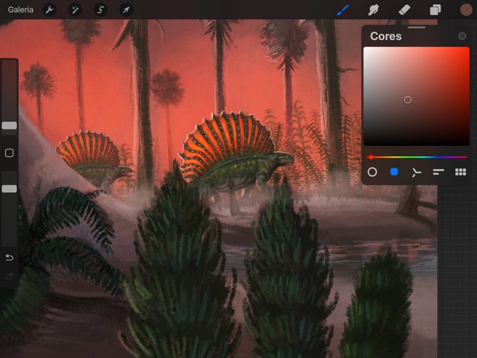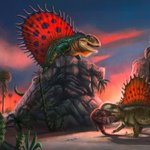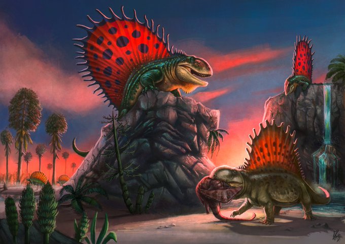 Essa rocha tem dono 😉 . Paisagem do período Permiano. Dois machos Dimetrodon repousam enquanto uma fêmea acaba de garantir o seu jantar, um Diplocaulus. Ao fundo, um par de Edaphosaurus caminha com tranquilidade. #dimetrodon #permian #paleoart