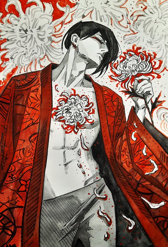 Inktober. Day 29 - Chrysanthemums. #Inktober #inktober2022 #Chrysanthemum #flowers #guy #red #art #illustration #traditionalart #PhantomRin