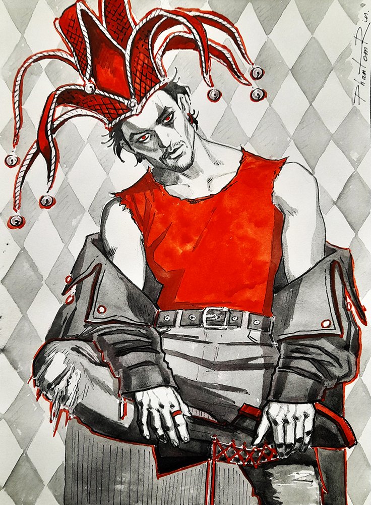 Inktober. Day 31 - Jester. #Inktober #inktober2022 #jester #joker #guy #red #art #illustration #traditionalart #PhantomRin
