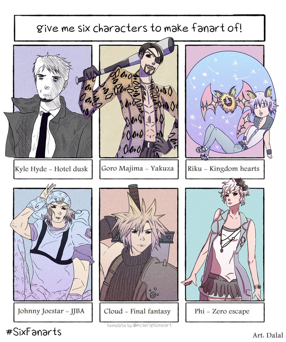 Six fanarts challenge done! Some of the requests from both Instagram and Twitter. #sixfanarts #kingdomhearts #riku #yakuza #majima #majimagoro #ryugagotoku #zeroescape #phi #hoteldusk #kylehyde #jjba #jojosbizarreadventure #johnnyjoestar #cloud #finalfantasy7remake