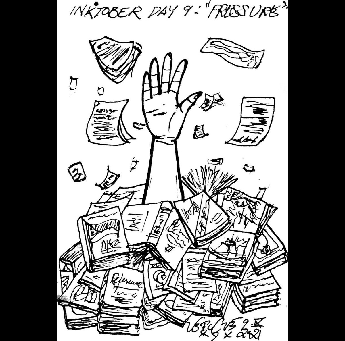 “Pressure” Day 9/31 #Inktober2021 (Time runs out as things pile up. Revising can be stressful, as is cleaning hands of ink stains.) #inktober #inktoberph #ink #sketch #drawing #pressure #book #pile #informationoverload #overwhelming #academics #traditionalart #artprompt #artph
