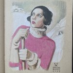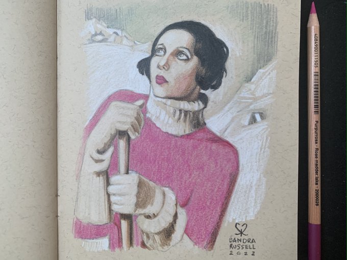 My coloured pencil #sketch for @StudioTeaBreak's #PortraitChallenge of ‘Saint Moritz’, painted by Tamara de Lempicka, 1929. 👩🏻⛷❤️✍️ With touches of #colour_collective's #PinkMadderLake. #ArtistOnTwitter #pencilsketch #Illustrator #sketchbook #FridayFeeling