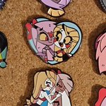 PINS!! Sis tweaked/added/removed the pin designs!! These are most likely the finalized designs! 🥰❤️ #HazbinHotel #HazbinHotelFanart @hazbinfanmerch #HelluvaBossFanart #HelluvaBoss #Alastor #PINS