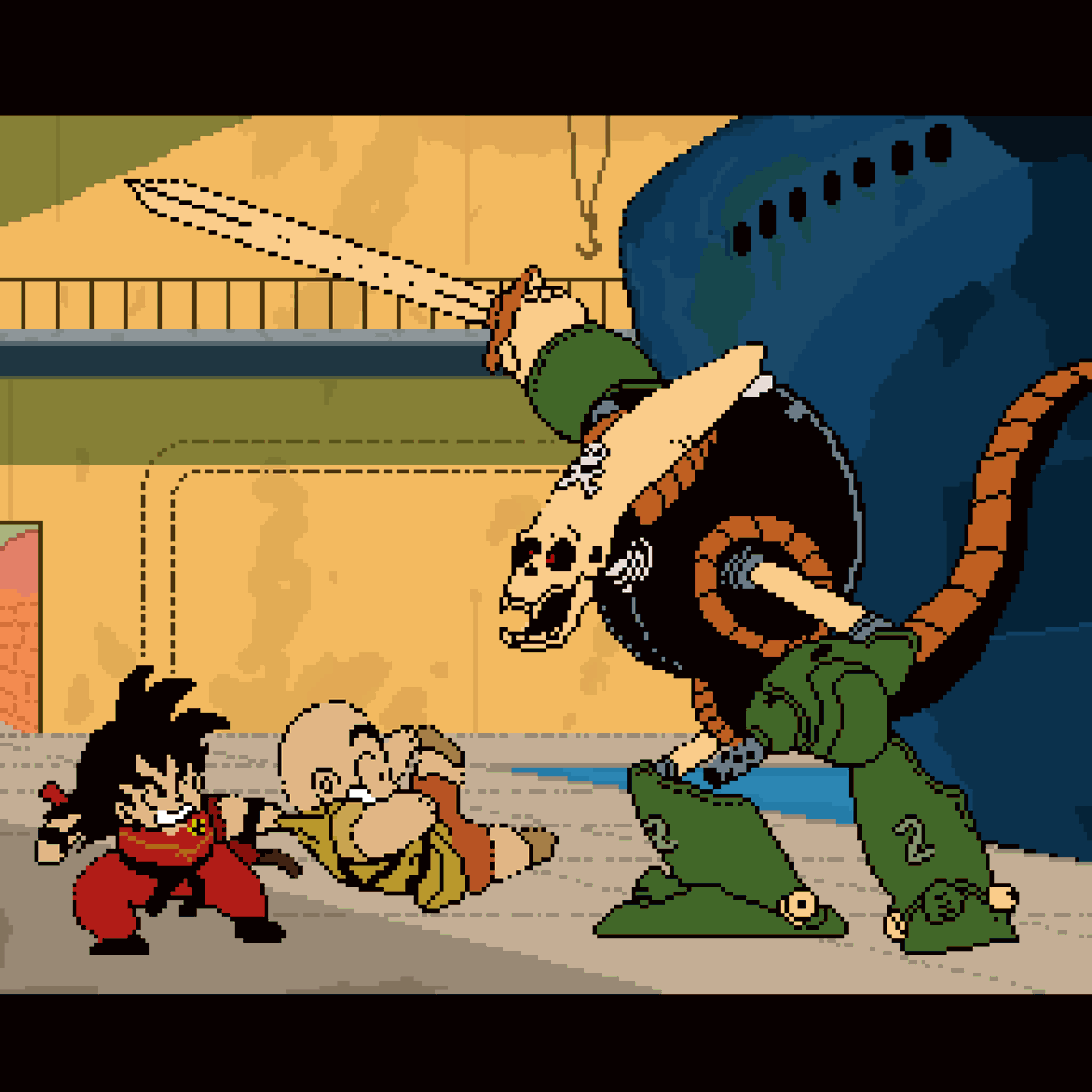 Finished my Dragon Ball #pixelart - Goku and Krillin versus the Pirate Robot! #海賊ロボ #PirateRobot #ドット絵 (see original res at lospec.com/i/fxdj)