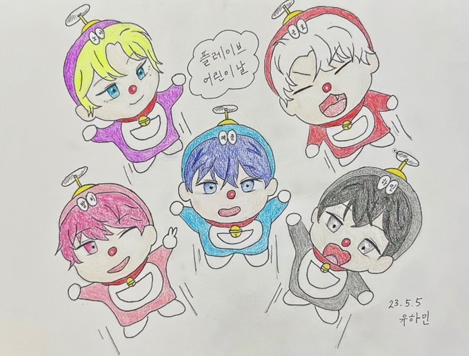 《哈民親手畫的PLAVE🖤》 🖤:這個大家都是七歲! 💙:因為七歲所以大家都沒有牙齒啊~ ❤️:哈民啊為什麼只有我的眼睛是閉起來的? 🖤:哥的眼睛畫起來很麻煩所以就沒畫了ㅋㅋㅋㅋㅋㅋㅋ #PLAVE #HAMIN #plavefanart #PLAVE_HAMIN