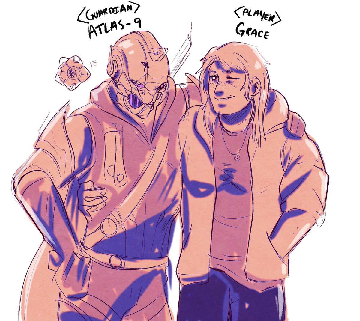 A very quick sketch for #PlayervsGuardian !! Atlas and I are the same height and also Small 8,) I love my funky little hunter vanguard man, #Destiny2Art