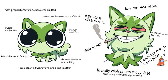 The duality of Sprigatito fanart for the past 24 hours #PokemonScarletViolet #PokemonDay2022