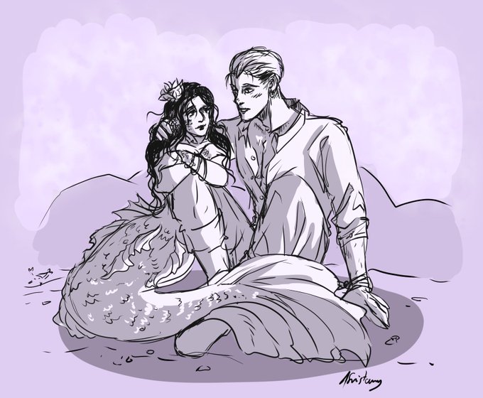 "Is purring your love language?" "Prrrrrrr" pokopiku 2 layer warmup doodle. with siren pieck (who hunts people sometimes) and her snack fisherman porco. happy mermay everyone. #mermay #pokopiku #pokopikku