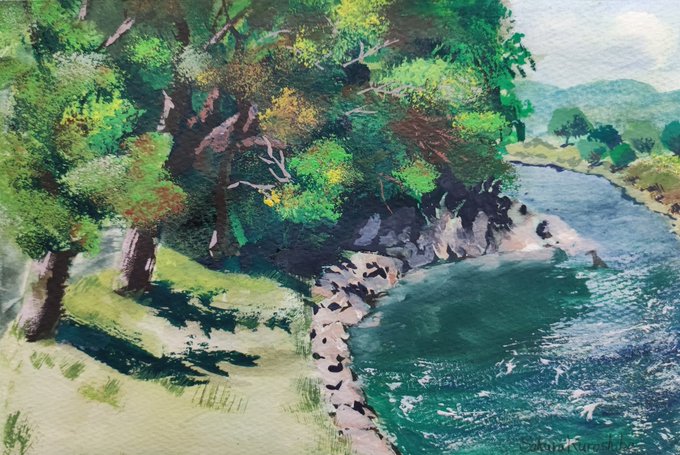 風景画を透明水彩とポスターカラーで描きました。 外でスケッチができてとても気分が良かったです🤗 #watercolor #watercolorpainting #drawing #水彩画 #postercolor #ポスターカラー #art #風景画 #landscapepainting #不透明水彩