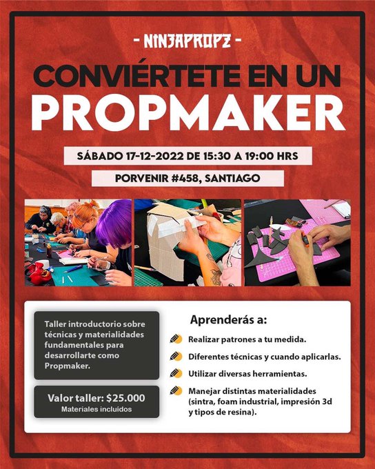 ¡Último taller del año! 🥳✨ Aprende a manejar las distintas materialidades y el uso correcto de ellas 🛠️ No te quedes fuera y reserva tu cupo :D #NinjaPropz #HazteNinja #cosplay #Propmaker #cosplaychile #pepakura #PropMakerChile #workshopchile #tallereschile #SmoothOn