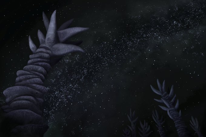Beneath the silent, gnarled lichens that rise monumental over the mosses and Cooksonia, the heavens are immaculate. #paleoart #Prototaxites #nightphotography