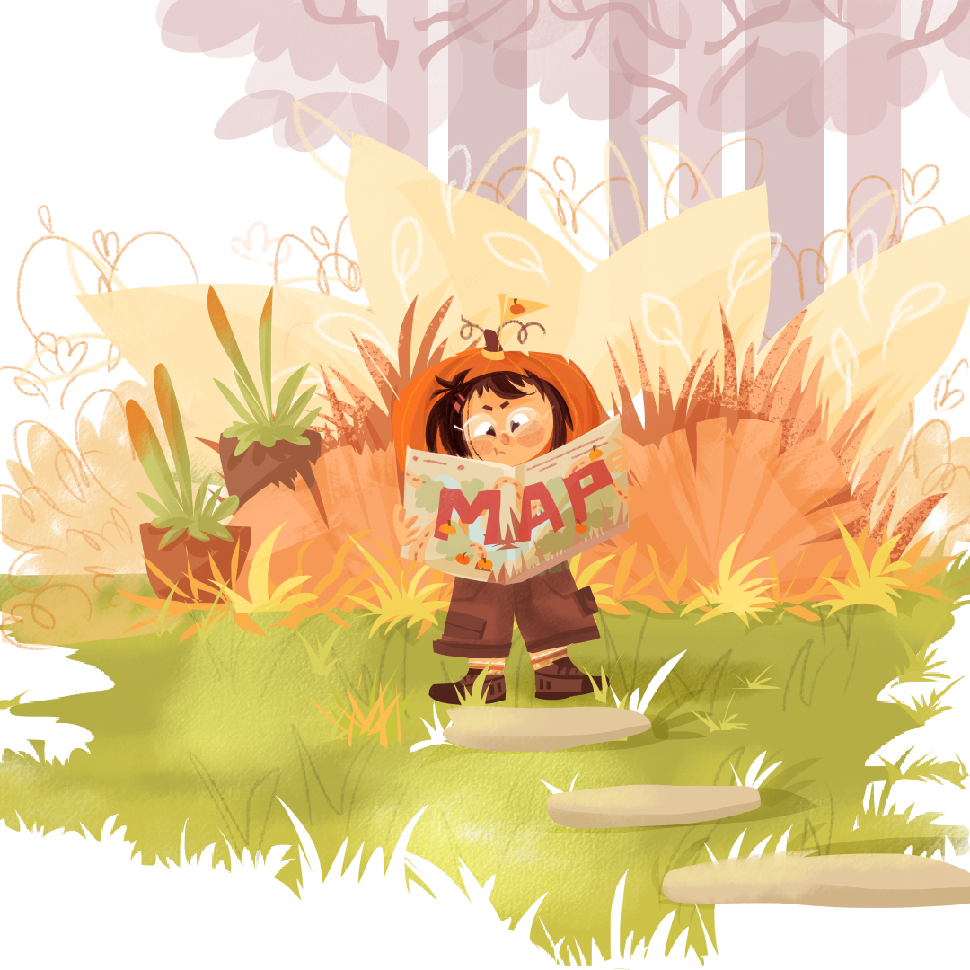 Join the Autumn Quest to find her the best pumpkin head-gear! #illustration #イラスト #ChildrensBooks #kidlit #kidlitart #pumpkinseason