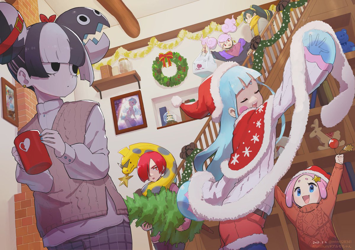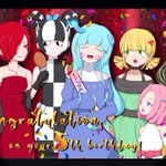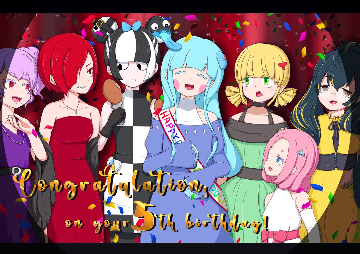 素敵なお祝い企画にお声掛けをいただけまして、僭越ながら僕もお誕生日のイラストを描かせていただきました🎉 パーティーの集合写真的なイメージで、左4人の👗のデザインはまつもと。さんからパク…お借りしました(色は勝手に着けました) #プルモちゃん5さい #プルモちゃん #Punitlium