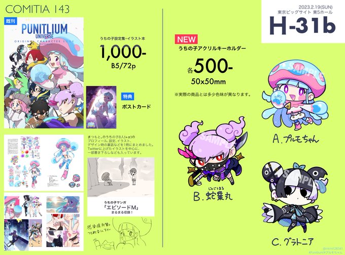 明日開催 #COMITIA143 お品書きです! 今回 本は既刊のみとなりますが、 描き下ろしのSDアクリルキーホルダー作ってみました。可愛く描けたので是非お手に取っていただければー! (※うちの子本は残りわずかとなりますのでご了承ください) #Punitlium #プルモちゃん