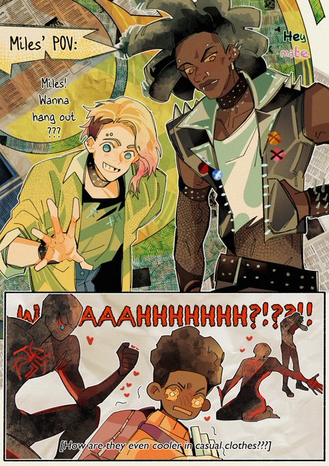 #PunkFlower drew my favourite scene from a fic called Mutualism by cruelzy ! 🌻 Hobie and Pav tried to sneak into Miles’ school, and poor Ganke gets dragged into his roommate’s love drama 😭 (1/2)