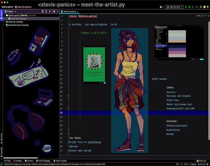 Meet the artist! Stevie edition :] Had a lot of fun with making this all work in a python style layout! #ArtistOnTwitter #MeetTheArtist #python